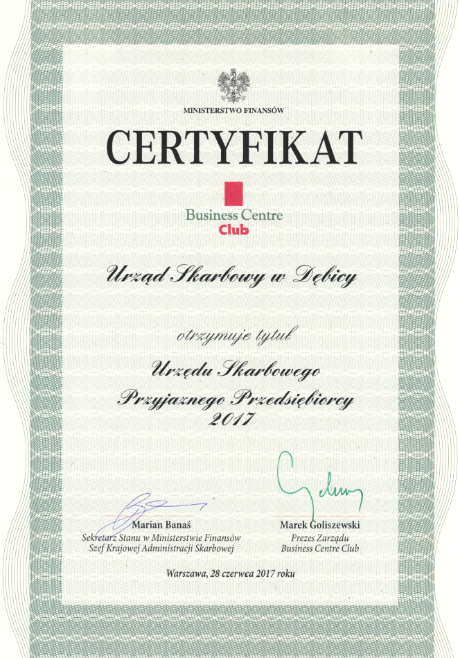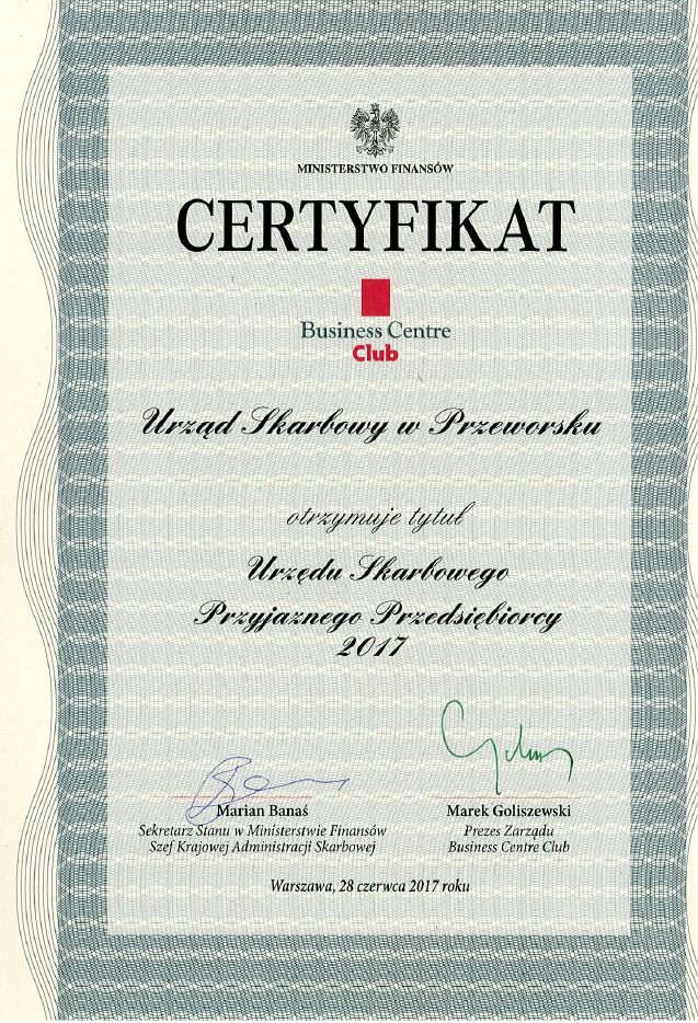 Gala finałowa konkursu „Urząd Skarbowy Przyjazny Przedsiębiorcy" odbyła się 28 czerwca 2017 r. w siedzibie Business Centre Club. 70 urzędów, wyróżnionych przez przedstawicieli biznesu, może posługiwać się tym tytułem przez rok, do czasu rozstrzygnięcia kolejnej edycji konkursu. Zaszczytne wyróżnienia przyznane zostały w tym roku trzem urzędom skarbowym z województwa podkarpackiego, a laureatami zostały: