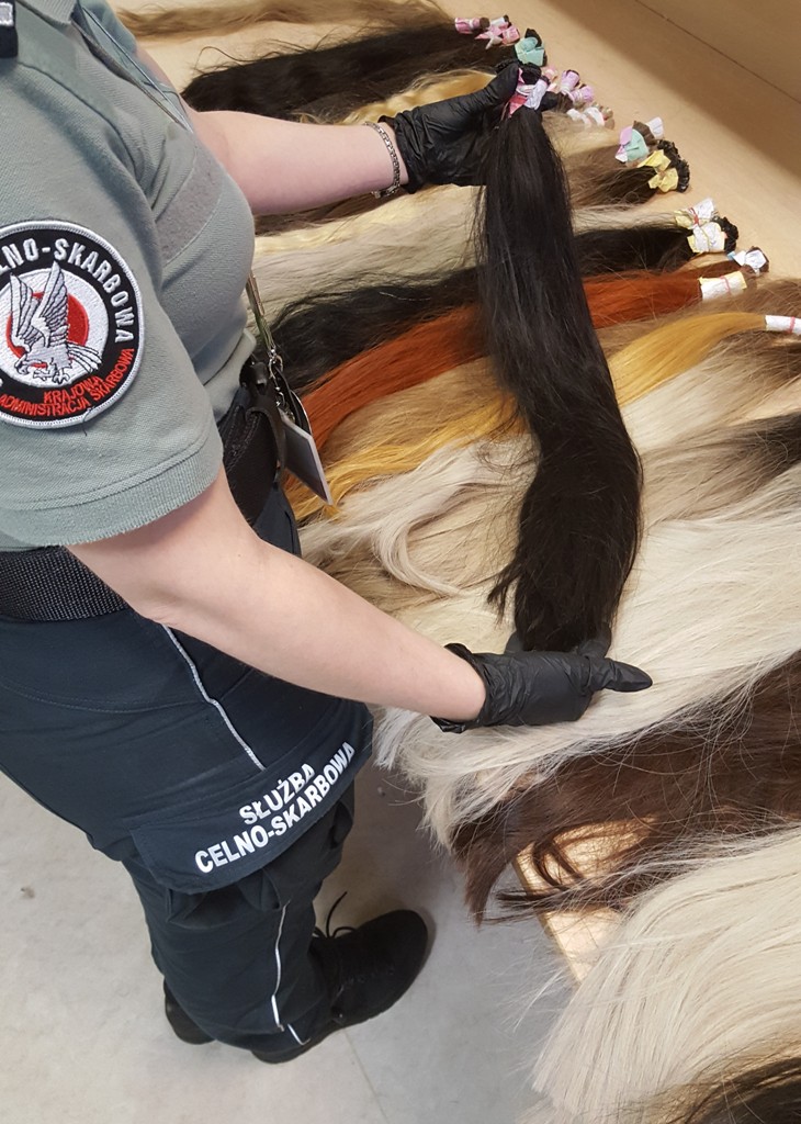 Podczas szczegółowej rewizji kabiny, uwagę funkcjonariuszy zwróciły owinięte folią pakunki. Okazało się, że mają bardzo nietypową zawartość- ludzkie włosy. Pukle o różnych kolorach i długościach ważyły prawie 5 kg. Najdłuższe z nich miały nawet 80 cm długości. Wartość wykrytego towaru oszacowana została na ponad 17 tys. złotych.