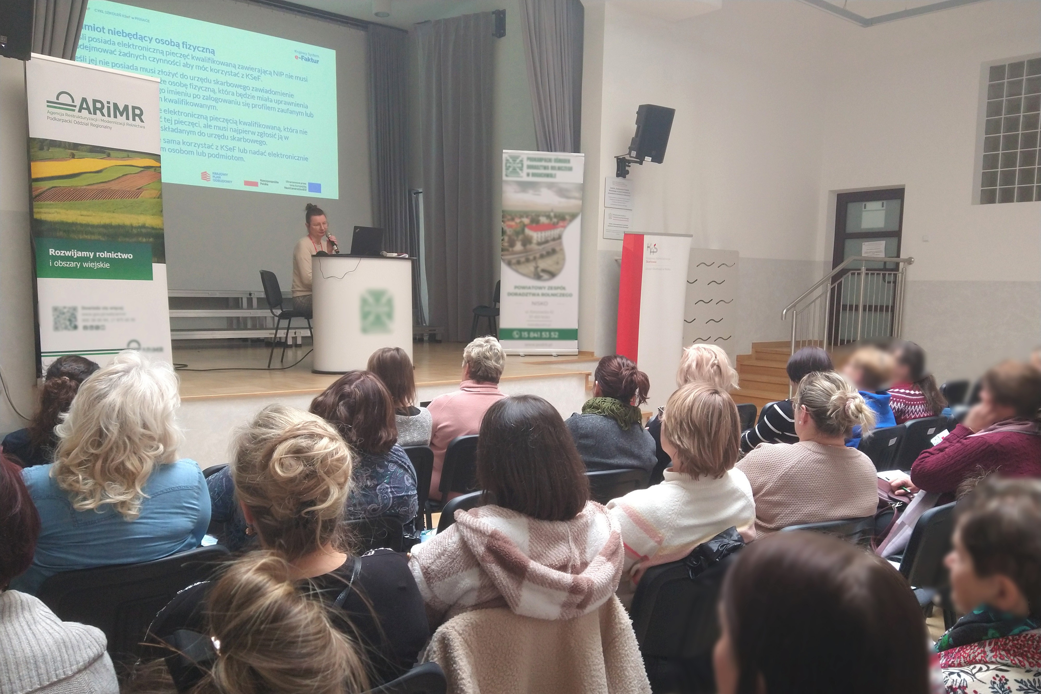 Również w Strzyżowie eksperci z Urzędu Skarbowego w Strzyżowie przeprowadzili szkolenie dla Kół Gospodyń Wiejskich działających na terenie gminy Czudec, przybliżając najistotniejsze zagadnienia związane z wdrożeniem Krajowego Systemu e-Faktur. Korzystając z okazji przedstawili także uczestnikom zalety korzystania z e-Urzędu Skarbowego oraz wyrażenia zgody na e-Korespondencję.