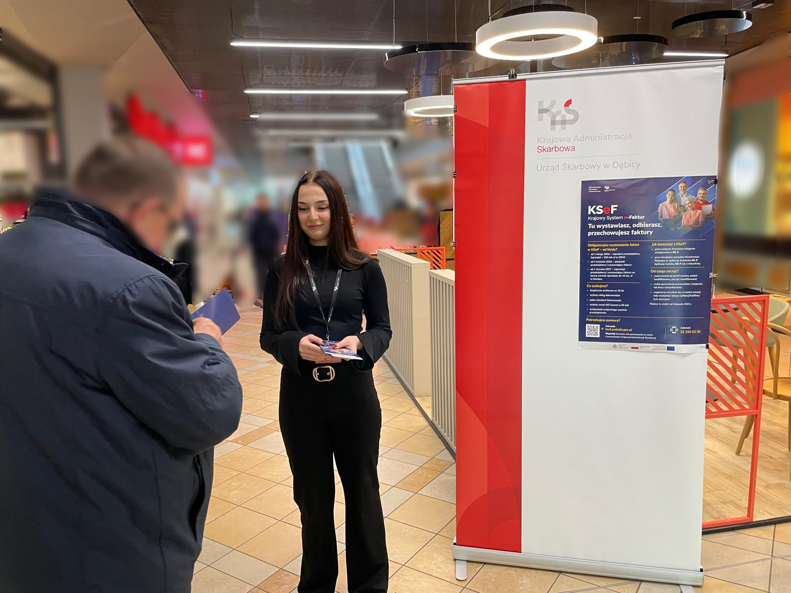 18 grudnia 2025 r. w godzinach od 10.00 do 15.00 pracownicy Działu Obsługi Bezpośredniej Urzędu Skarbowego w Dębicy prowadzili w Galerii Dębickiej akcję promocyjną Krajowego Systemu e-Faktur.