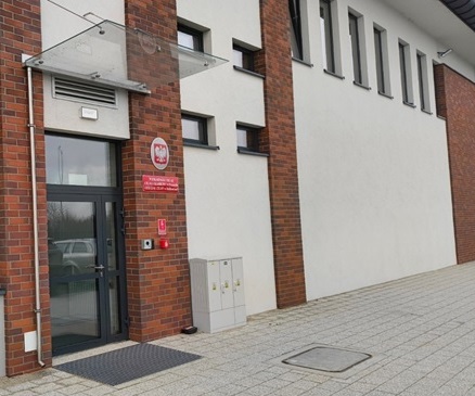 Po wejściu do budynku znajduje się klatka schodowa nieprzystosowana dla osób z niepełnosprawnością (bez windy). Z klatki schodowej do pokoju przesłuchań prowadzą schody. Pokój przesłuchań znajduje się na pierwszym piętrze budynku – tam znajdują się miejsca odpoczynku (stolik i krzesła). W pokoju przesłuchań znajduje się biurowa osłona/panel z pleksy, w której są okienka do podawania dokumentów.